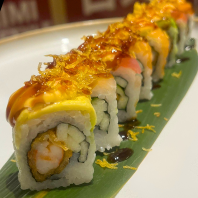 Inside: tempura shrimp and cucumber; external: tempura courgette, mayo, crispy...